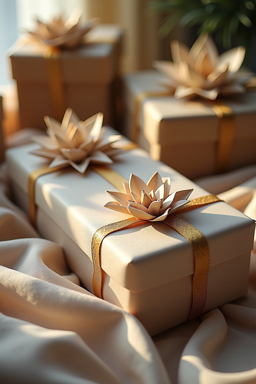 - Origami-Schachteln mit feinen Bändern für kleine Präsente